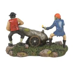Ahoy, matey! Set sail for adventure with this cheeky scene featuring two rascally pirates poised to unleash some ingenious mischief from their timeworn cannon. Standing at just around 3 inches tall, this whimsical village figure adds a dash of piratical flair to your Halloween or nautical-themed decor. With their colorful attire and devious expressions, these swashbucklers embody the legendary shenanigans of Caribbean pirates, making them a perfect conversation starter for your next gathering.